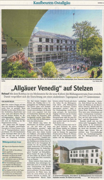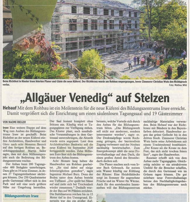 Der Ausbau des Bildungszentrums in Irsee hat einen neuen Meilenstein erreicht. Im Oktober 2019 feierte der neue Erweiterungsbau „Küferei“ das Richtfest. Bereits acht Monate arbeiten die Handwerker am Rohbau. Unter anderem ist Herr Michael Burz und Herr Campo Sanchez als Ingenieur an dem Projekt beteiligt. Herr Burz erklärt uns, dass schon bei Baubeging kreative Lösungen gefordert wurden.