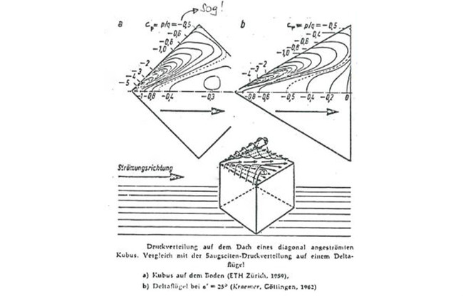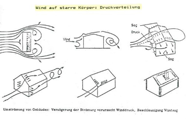 Ein sehr ähnliches Phänomen kann bei angeströmten Gebäuden beobachtet werden: Weht ein Wind in Richtung der Gebäudeecke, so entsteht über dem Dach ein Wirbelfeld. In der Nähe der Dachkante und Dachecke entstehen dabei die höchsten Unterdrücke, was das "Abheben" von Dachplatten zur Folge haben kann.