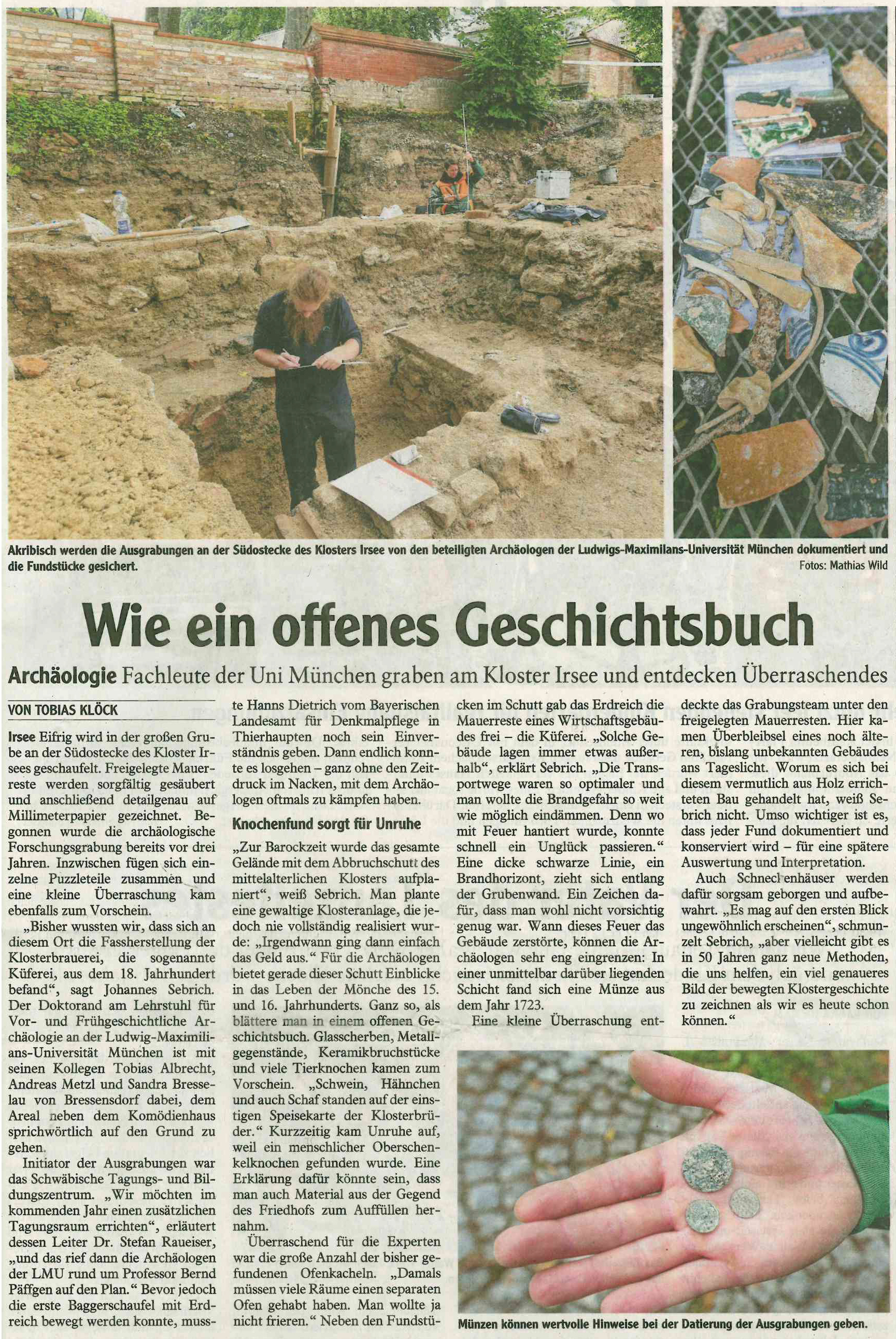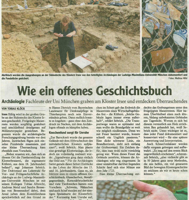 Auf Veranlassung des Bayerischen Landesamts für Denkmalpflege werden im Kloster Irsee, Untersuchungen durch die LMU, Fakultät für Kulturwissenschaften, unter der Leitung von Herr Prof. Dr. Bernd Päffgen, durchgeführt. Im Zuge dieser Ausgrabungen war es notwendig die Klostermauer freizulegen und statisch zu sichern. Die Maßnahme wurde durch parallele Nachberechnungen und Sicherungsmaßnahmen intensiv begleitet.