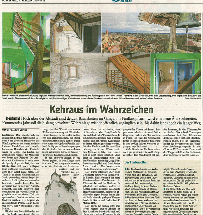 "Kehraus im Wahrzeichen" Artikel über den Fünfknopfturm aus der Allgäuer Zeitung vom 4. Februar 2016 | JPG