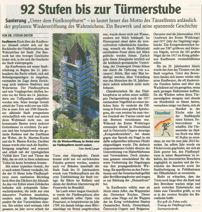 "92 Stufen bis zur Türmerstube" Artikel über den Fünfknopfturm aus der Allgäuer Zeitung vom 30. Mai 2017 | JPG